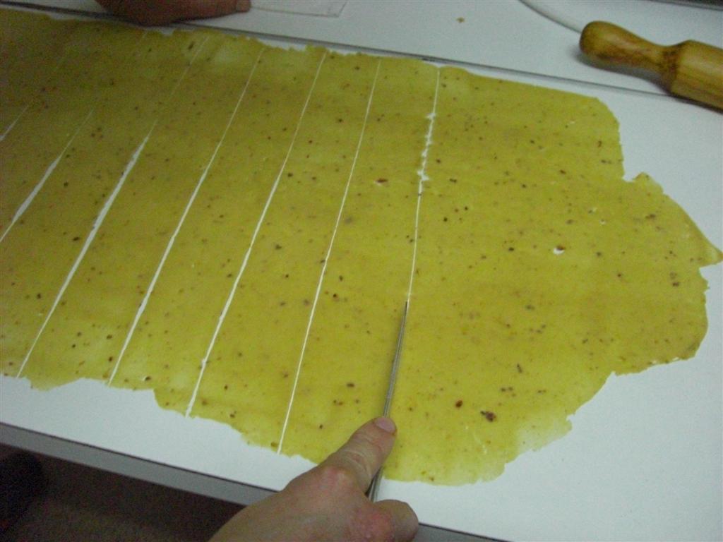 • Extender con el rodillo lo más fino posible, cortar en cuadritos y darle forma doblando dos esquinas opuestas.