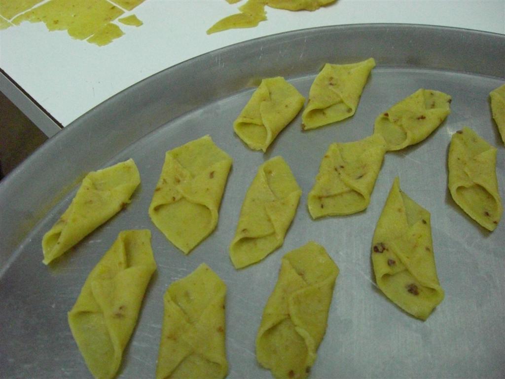 • Extender con el rodillo lo más fino posible, cortar en cuadritos y darle forma doblando dos esquinas opuestas.